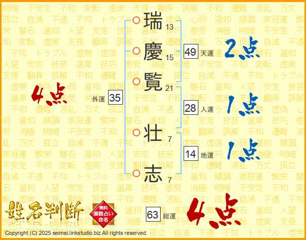 瑞(13画)慶(15画)覧(21画) 壮(7画)志(7画)