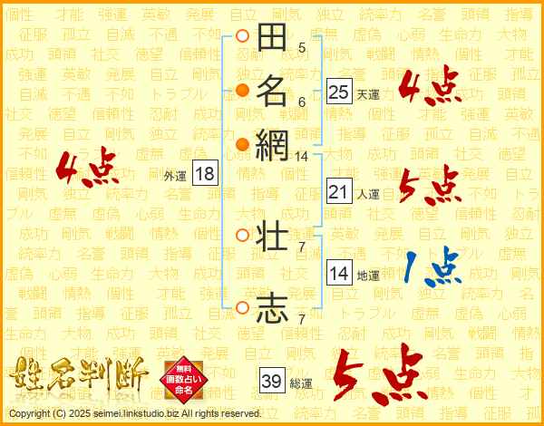 田(5画)名(6画)網(14画) 壮(7画)志(7画)