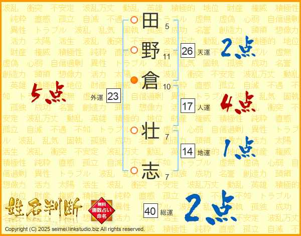 田(5画)野(11画)倉(10画) 壮(7画)志(7画)