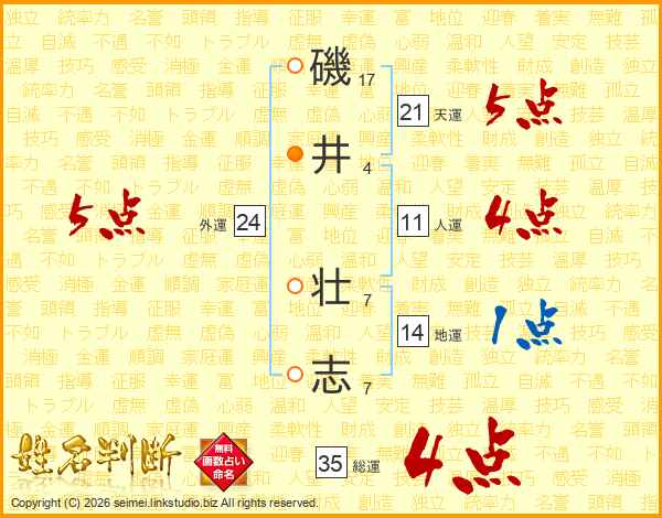 生活面を象徴する運勢です。外部から受ける影響力を表し、結婚運、家庭運や職場、環境への順応性を表します。総運から人運を引いた画数。姓や名が1文字の場合を除く。