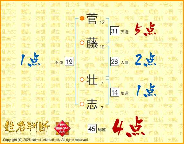 菅(12画)藤(19画) 壮(7画)志(7画)