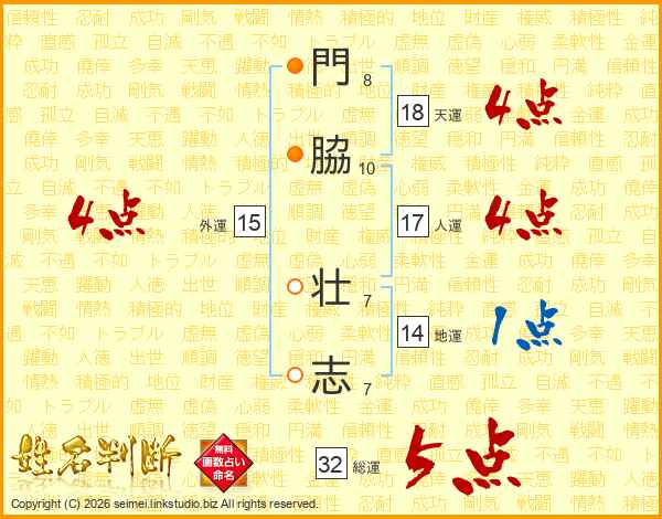 門(8画)脇(10画) 壮(7画)志(7画)