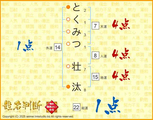 と(2画)く(1画)み(3画)つ(1画) 壮(7画)汰(8画)