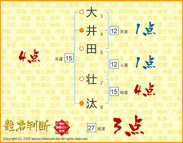 大(3画)井(4画)田(5画) 壮(7画)汰(8画)