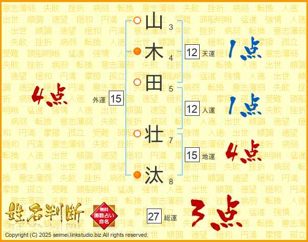 山(3画)木(4画)田(5画) 壮(7画)汰(8画)