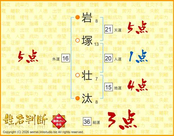 岩(8画)塚(13画) 壮(7画)汰(8画)