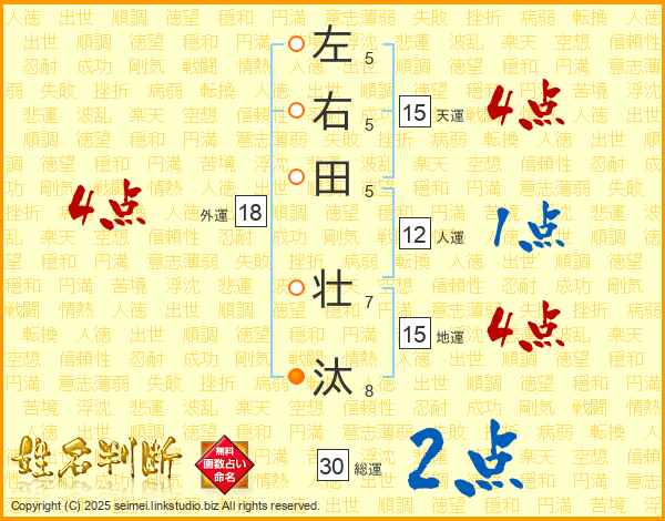 左(5画)右(5画)田(5画) 壮(7画)汰(8画)