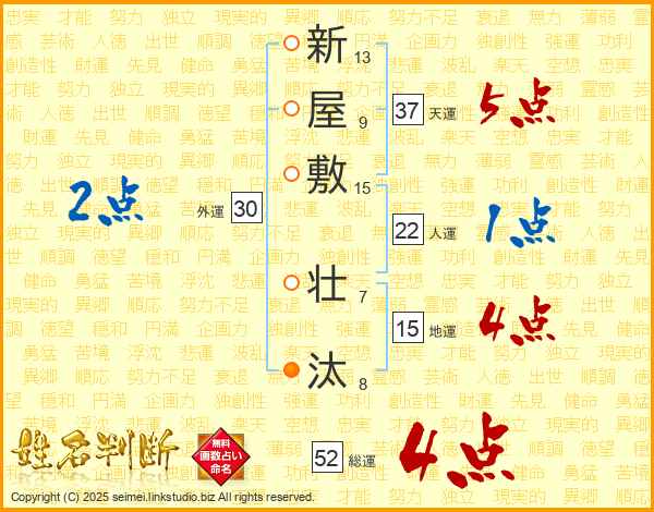 新(13画)屋(9画)敷(15画) 壮(7画)汰(8画)