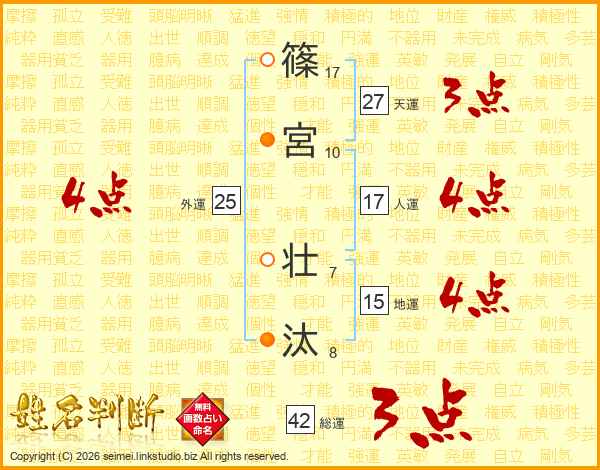 篠(17画)宮(10画) 壮(7画)汰(8画)
