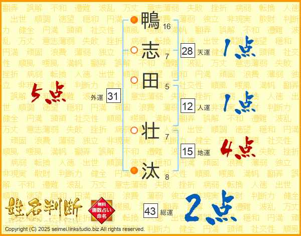 鴨(16画)志(7画)田(5画) 壮(7画)汰(8画)