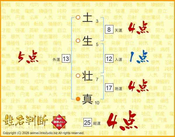 生活面を象徴する運勢です。外部から受ける影響力を表し、結婚運、家庭運や職場、環境への順応性を表します。総運から人運を引いた画数。姓や名が1文字の場合を除く。
