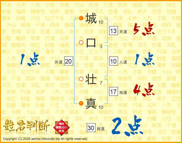 生活面を象徴する運勢です。外部から受ける影響力を表し、結婚運、家庭運や職場、環境への順応性を表します。総運から人運を引いた画数。姓や名が1文字の場合を除く。