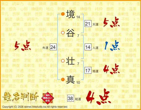 生活面を象徴する運勢です。外部から受ける影響力を表し、結婚運、家庭運や職場、環境への順応性を表します。総運から人運を引いた画数。姓や名が1文字の場合を除く。