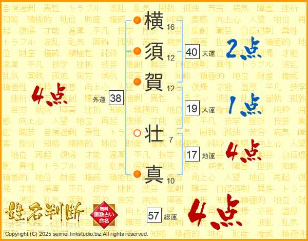 横(16画)須(12画)賀(12画) 壮(7画)真(10画)
