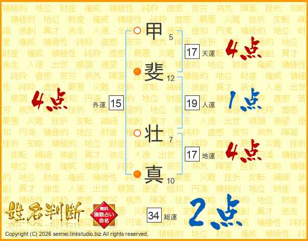 生活面を象徴する運勢です。外部から受ける影響力を表し、結婚運、家庭運や職場、環境への順応性を表します。総運から人運を引いた画数。姓や名が1文字の場合を除く。