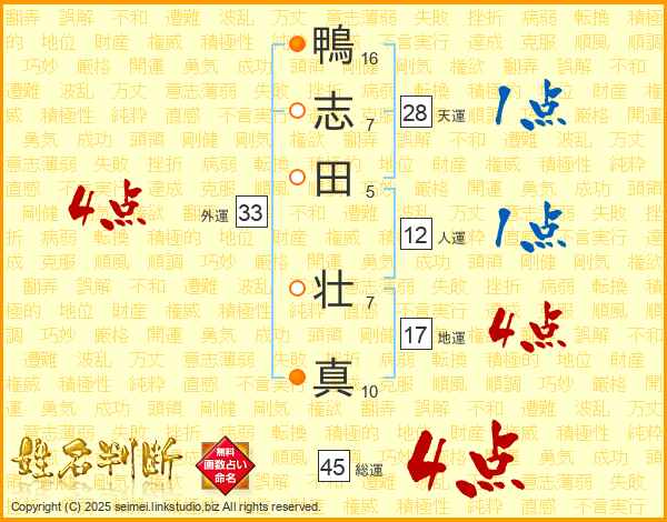 鴨(16画)志(7画)田(5画) 壮(7画)真(10画)