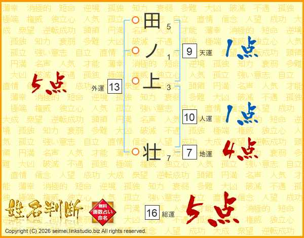 田(5画)ノ(1画)上(3画) 壮(7画)