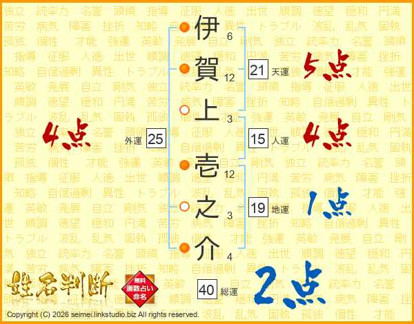 伊(6画)賀(12画)上(3画) 壱(12画)之(3画)介(4画)