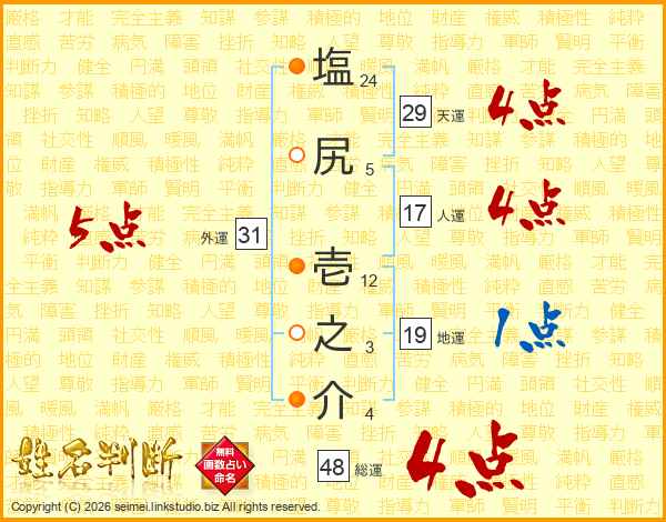 塩(24画)尻(5画) 壱(12画)之(3画)介(4画)