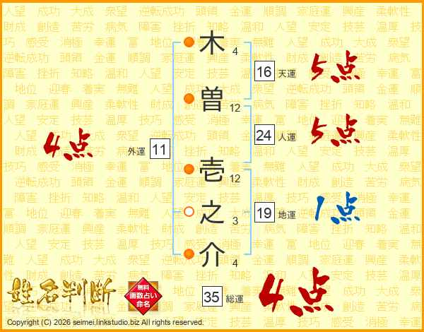 木(4画)曽(12画) 壱(12画)之(3画)介(4画)