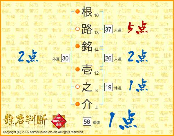 根(10画)路(13画)銘(14画) 壱(12画)之(3画)介(4画)
