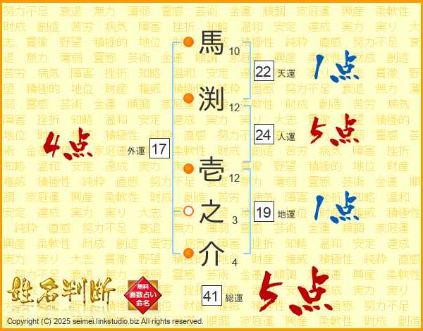 馬(10画)渕(12画) 壱(12画)之(3画)介(4画)