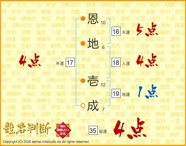 生活面を象徴する運勢です。外部から受ける影響力を表し、結婚運、家庭運や職場、環境への順応性を表します。総運から人運を引いた画数。姓や名が1文字の場合を除く。