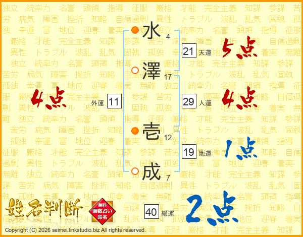生活面を象徴する運勢です。外部から受ける影響力を表し、結婚運、家庭運や職場、環境への順応性を表します。総運から人運を引いた画数。姓や名が1文字の場合を除く。
