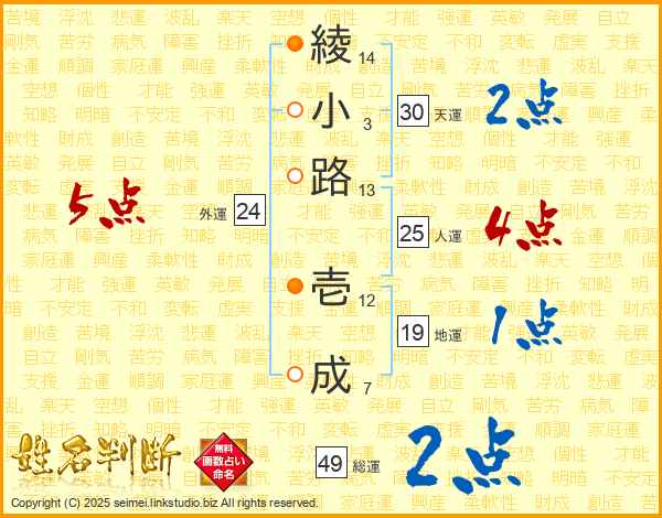 綾(14画)小(3画)路(13画) 壱(12画)成(7画)