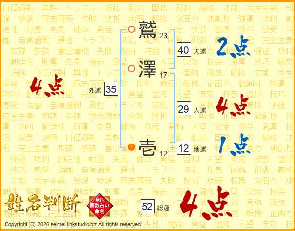 画数の奇数(○陽)と偶数(●陰)の配列で吉凶を占います。どちらかにかたよる名前は大凶名で避ける必要があります。画数の奇数偶数。