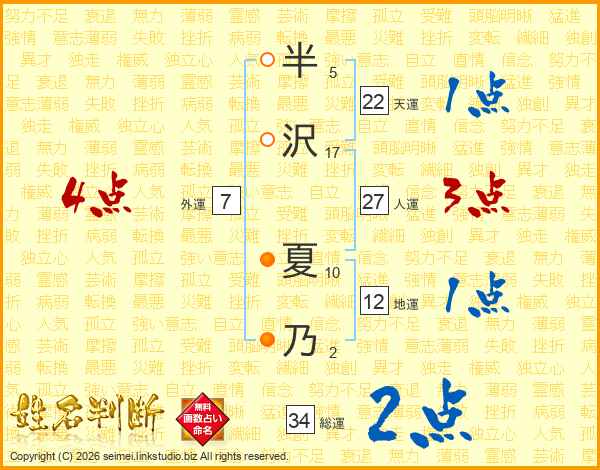 半(5画)沢(17画) 夏(10画)乃(2画)