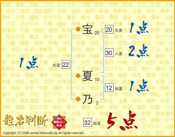 生活面を象徴する運勢です。外部から受ける影響力を表し、結婚運、家庭運や職場、環境への順応性を表します。総運から人運を引いた画数。姓や名が1文字の場合を除く。