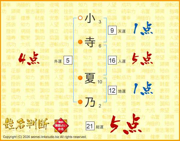 小寺夏乃さんの総運は21画の5点!