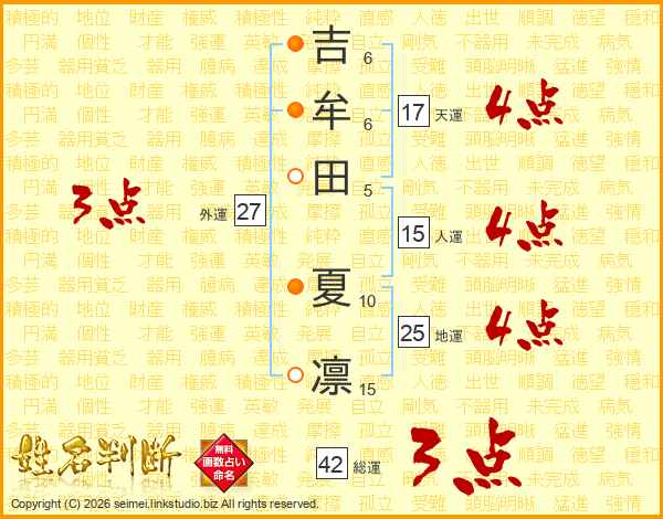 吉(6画)牟(6画)田(5画) 夏(10画)凛(15画)