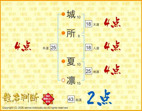 城(10画)所(8画) 夏(10画)凛(15画)
