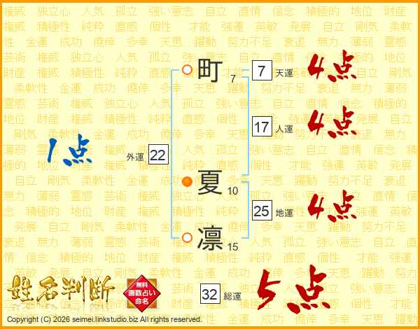 生活面を象徴する運勢です。外部から受ける影響力を表し、結婚運、家庭運や職場、環境への順応性を表します。総運から人運を引いた画数。姓や名が1文字の場合を除く。