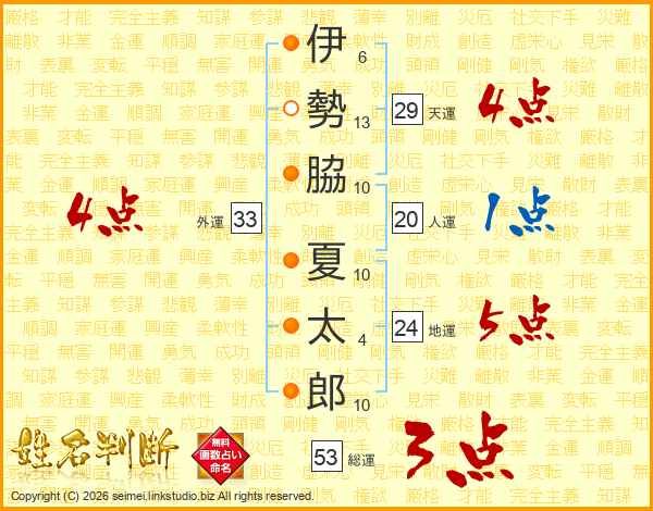 伊(6画)勢(13画)脇(10画) 夏(10画)太(4画)郎(10画)