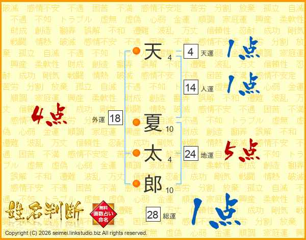 生活面を象徴する運勢です。外部から受ける影響力を表し、結婚運、家庭運や職場、環境への順応性を表します。総運から人運を引いた画数。姓や名が1文字の場合を除く。