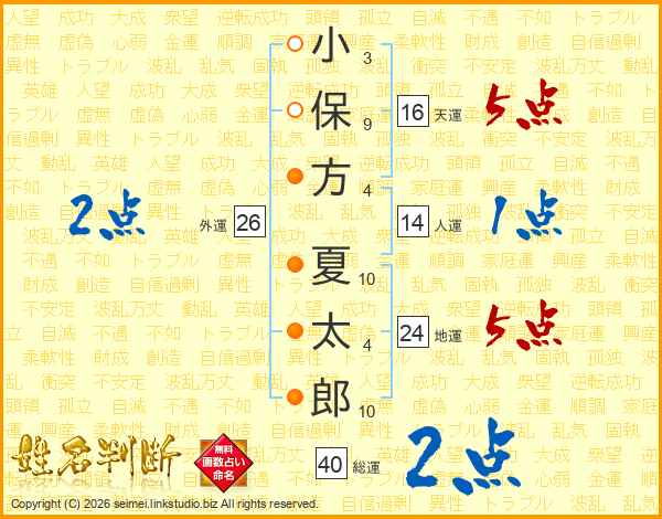 小(3画)保(9画)方(4画) 夏(10画)太(4画)郎(10画)