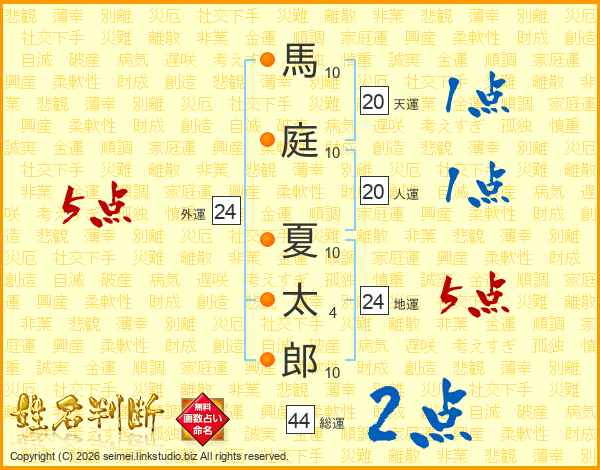 馬(10画)庭(10画) 夏(10画)太(4画)郎(10画)