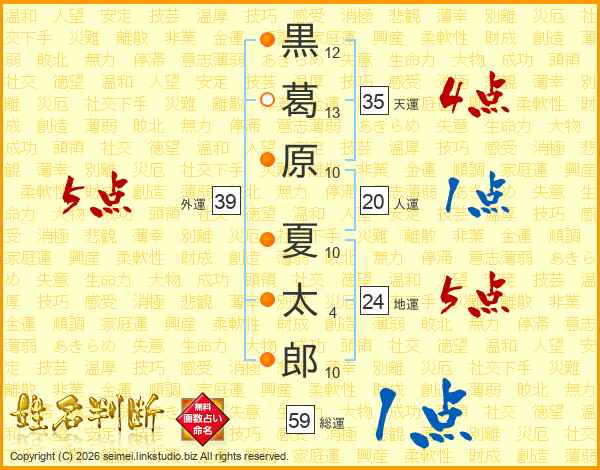 黒葛原夏太郎さんの外運は39画の5点!