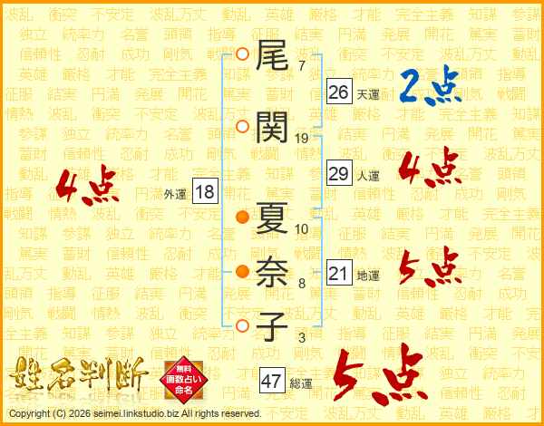 尾(7画)関(19画) 夏(10画)奈(8画)子(3画)