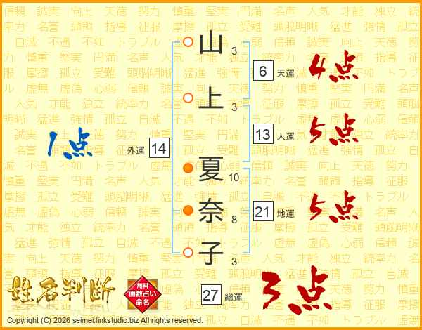 山(3画)上(3画) 夏(10画)奈(8画)子(3画)
