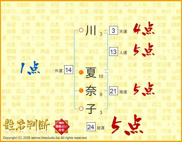 生活面を象徴する運勢です。外部から受ける影響力を表し、結婚運、家庭運や職場、環境への順応性を表します。総運から人運を引いた画数。姓や名が1文字の場合を除く。