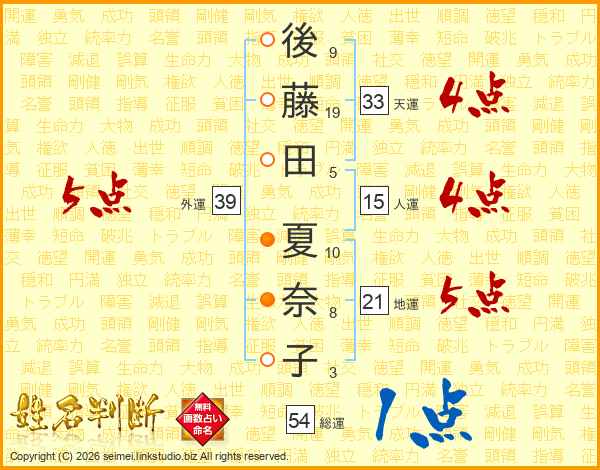 後(9画)藤(19画)田(5画) 夏(10画)奈(8画)子(3画)