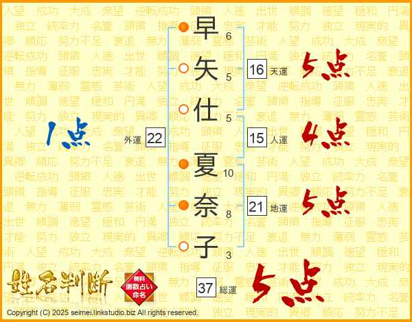 早(6画)矢(5画)仕(5画) 夏(10画)奈(8画)子(3画)