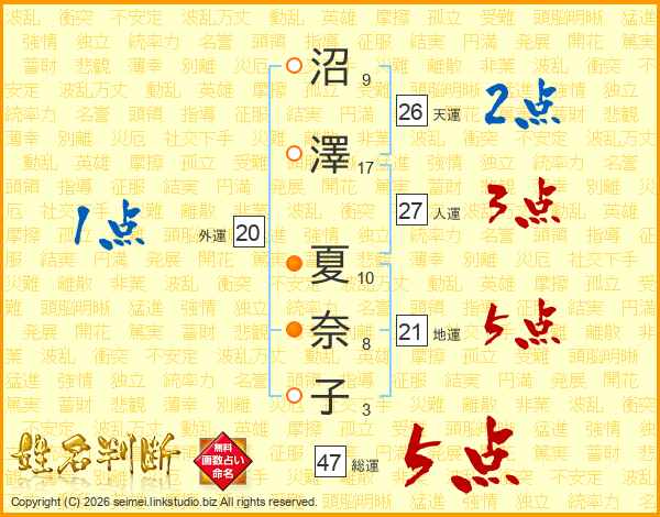 沼(9画)澤(17画) 夏(10画)奈(8画)子(3画)