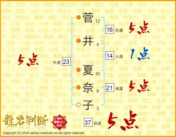 菅井夏奈子さんの総運は37画の5点!