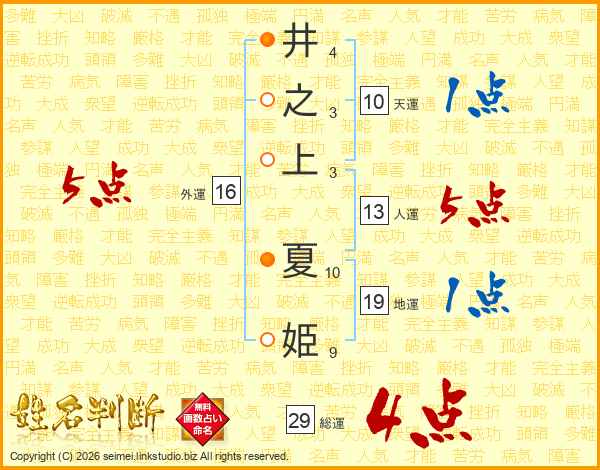 井(4画)之(3画)上(3画) 夏(10画)姫(9画)