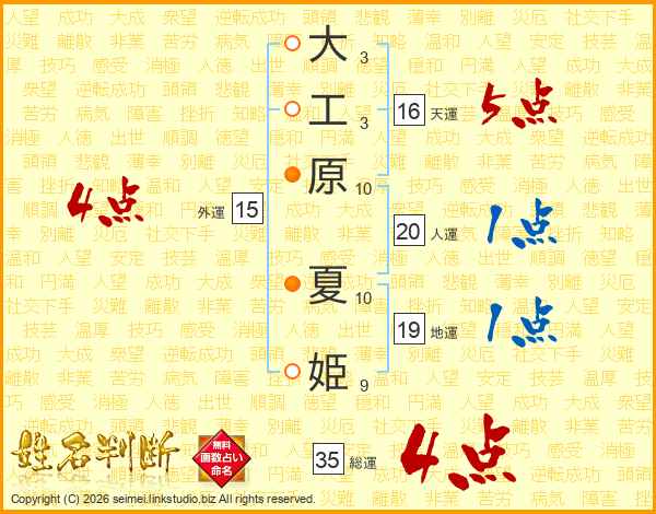 大(3画)工(3画)原(10画) 夏(10画)姫(9画)
